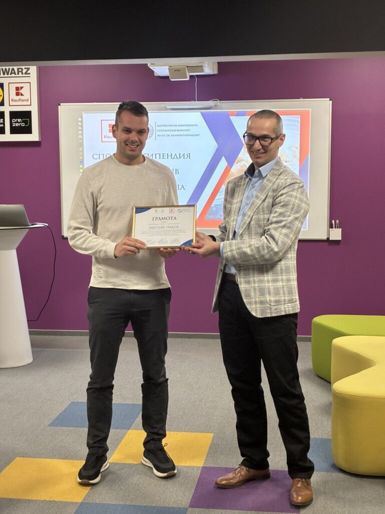 Наградите бяха връчени лично от Цветомир Узунов, финансов директор на Kaufland България и възпитаник на Стопанския факултет, специалност „Икономика“, който поздрави студентите и ги мотивира с вдъхновяващи думи за постоянство, дисциплина и професионално развитие.