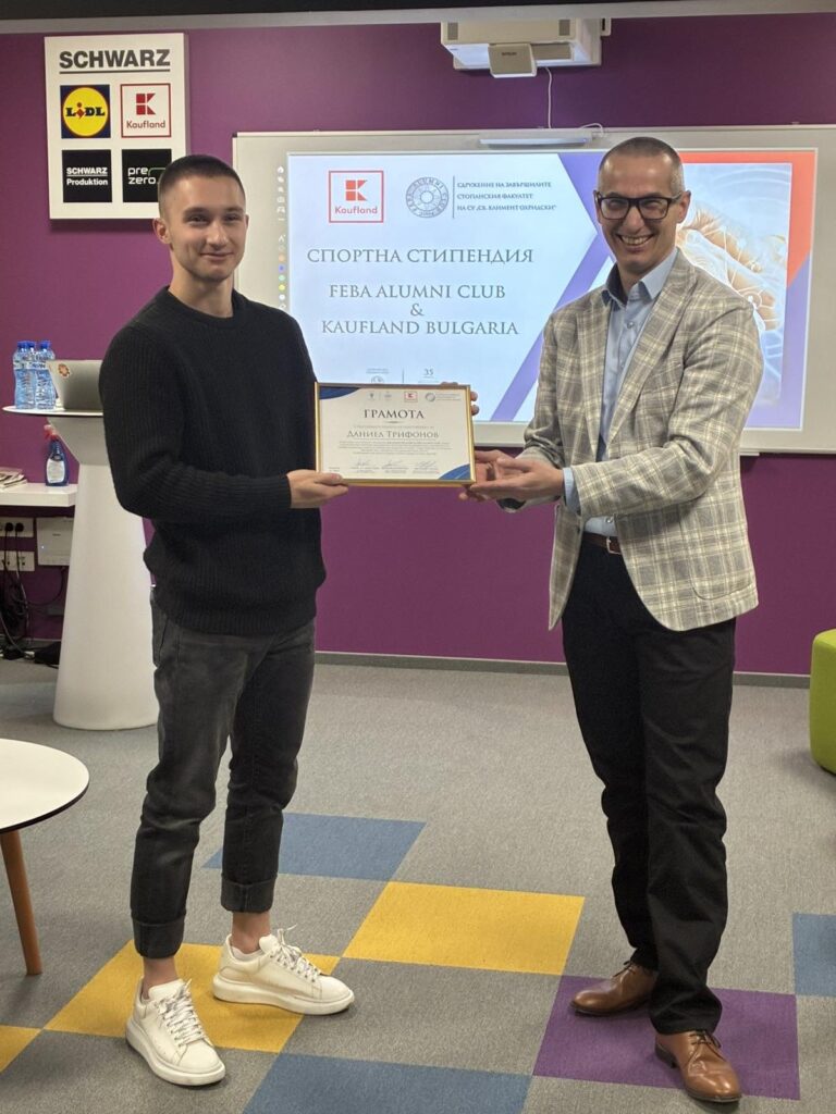 Kaufland България и FEBA Alumni Club отличиха трима изявени студенти спортисти от Стопанския факултет за техните високи постижения през 2025 година в рамките на инициативата „Спортна стипендия Kaufland България x FEBA Alumni Club “. Инициативата има за цел да насърчава студентите, които успешно съчетават академичното си развитие със спортни успехи на национално и международно ниво.