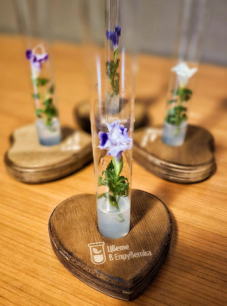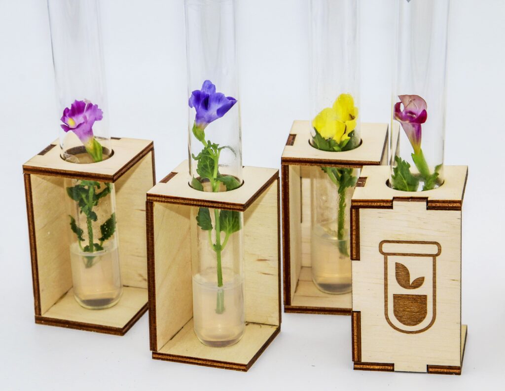 Ние произвеждаме растения в стерилна лабораторна среда, без почва, без пестициди, без ГМО и без нужда от напояване. Растението живее 6+ месеца в затворена система, без грижи, без поливане и без допълнителни ресурси. Само си извършва процесите дишане и фотосинтеза. Цъфти, прецъфтява и отново образува нови пъпки вътре в епруветката. След изчерпване на хранителната среда може да бъде пресадено в саксия, където продължава своя живот.