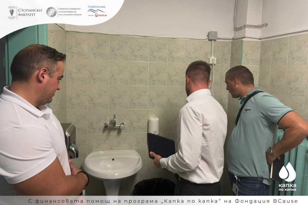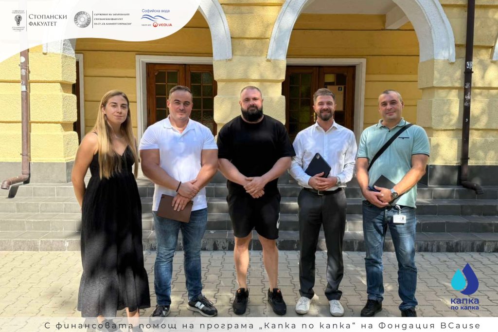 Тази седмица Стопанският факултет беше посетен от инж. Христо Апостолов, мениджър „Бизнес развитие“ във „Веолия“ България, и Борислав Апостолов, мениджър „Комплексни и нерегулирани услуги” от „Софийска вода“ АД, които обсъдиха заедно с академичния екип (ръководителят на проекта гл. ас. д-р Алексей Потебня, Адриана Браничева – изпълнителен директор на Сдружение на завършилите Стопански факултет и Боян Петров – фасилити мениджър на Стопански факултет) първите стъпки по реализацията и технологичните решения.